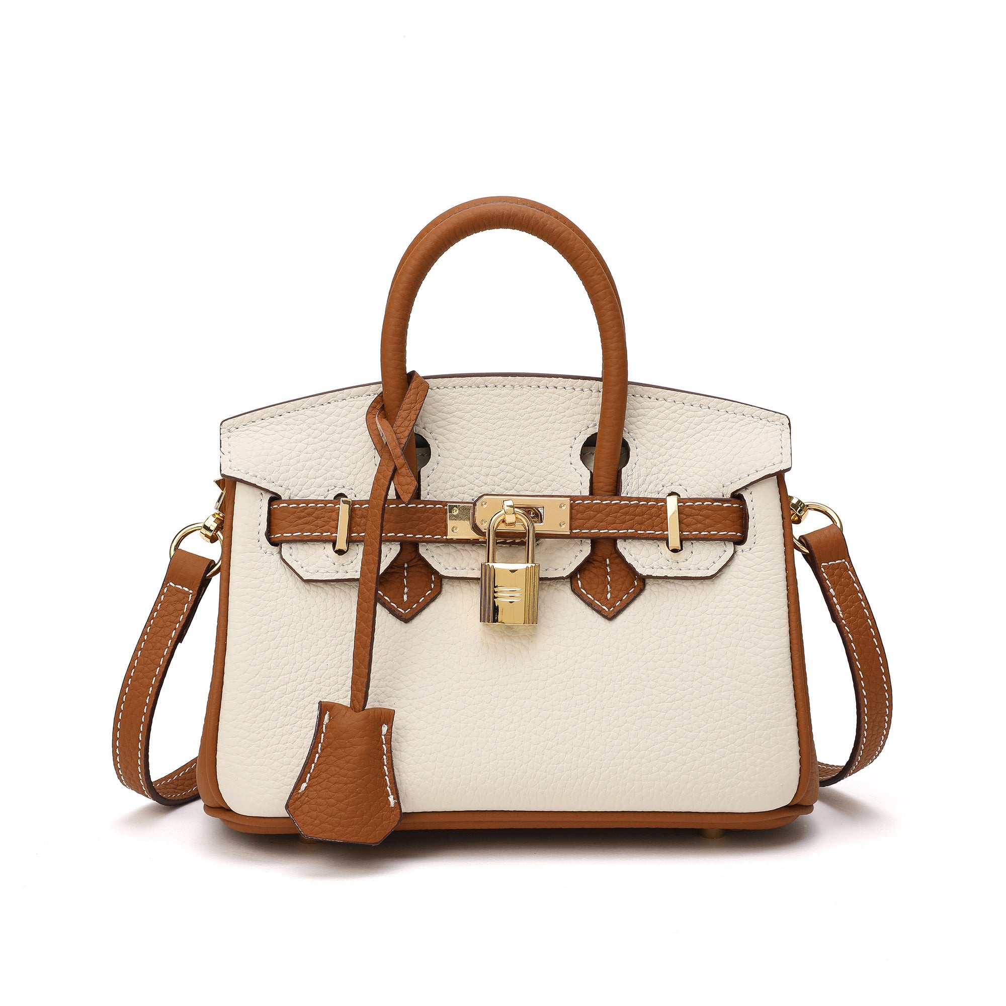 Details: Single rolled top handle, Detachable shoulder strap, Foldover flap with lock and key closure