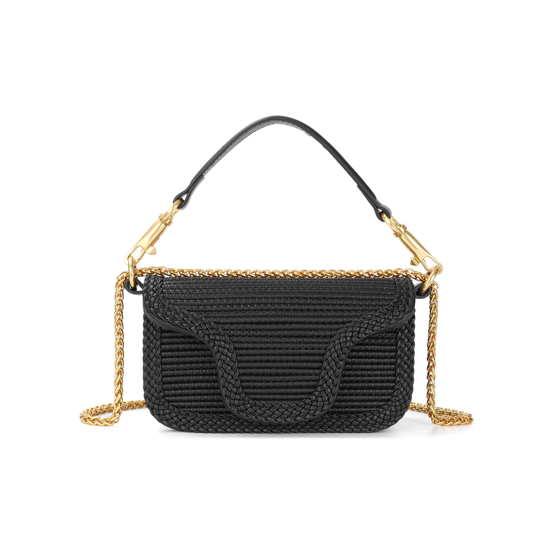 Discover timeless elegance with this braided leather crossbody bag. Meticulously crafted with fine braided leather detailing, this bag seamlessly combines style and function. Featuring a gold-tone chain strap and a detachable top handle, it offers versatile carrying options for any occasion. The interior is spacious enough to accommodate your essentials, and the magnetic closure ensures your belongings are secure and includes a convenient open pocket for easy organization of your essentials. The structured design and elegant shape make it the perfect accessory for both casual outings and special events.