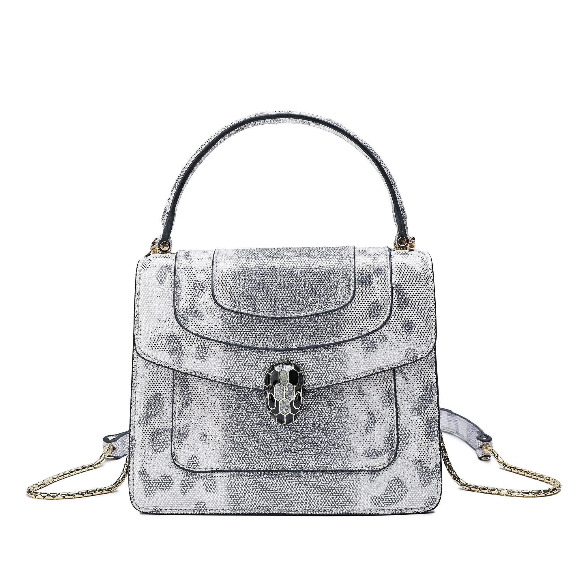Details: Full-grain snake embossed leather satchel/ shoulder bag with serpentine snap-closure hardware with three separate interior compartments and an adjustable shoulder strap.