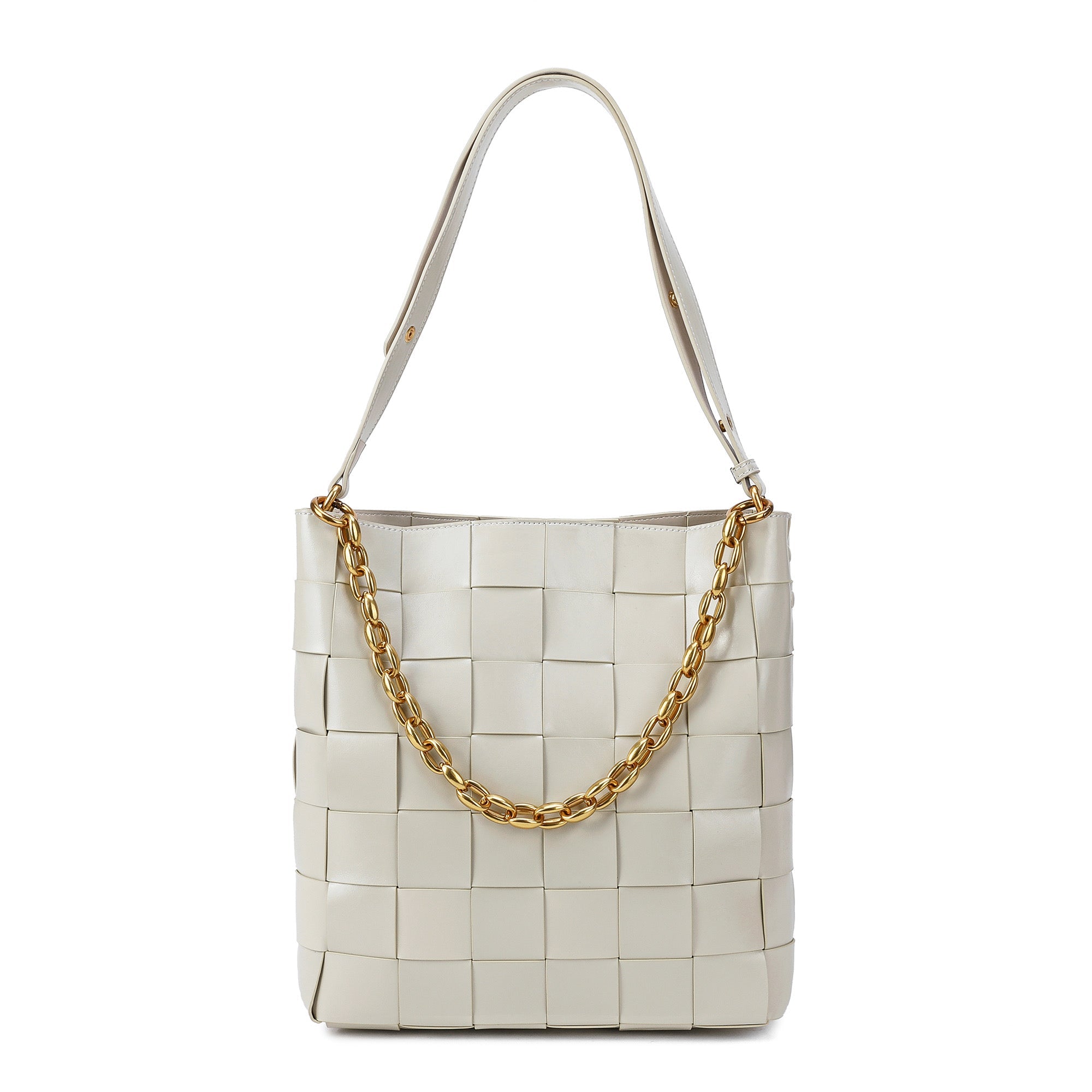 Exterior Features: Hand Woven Leather Tote, removable golden chain